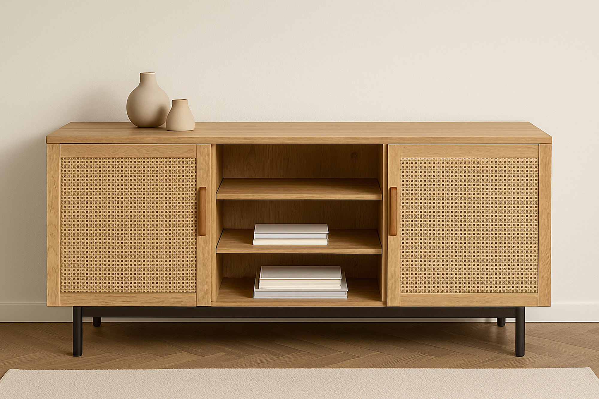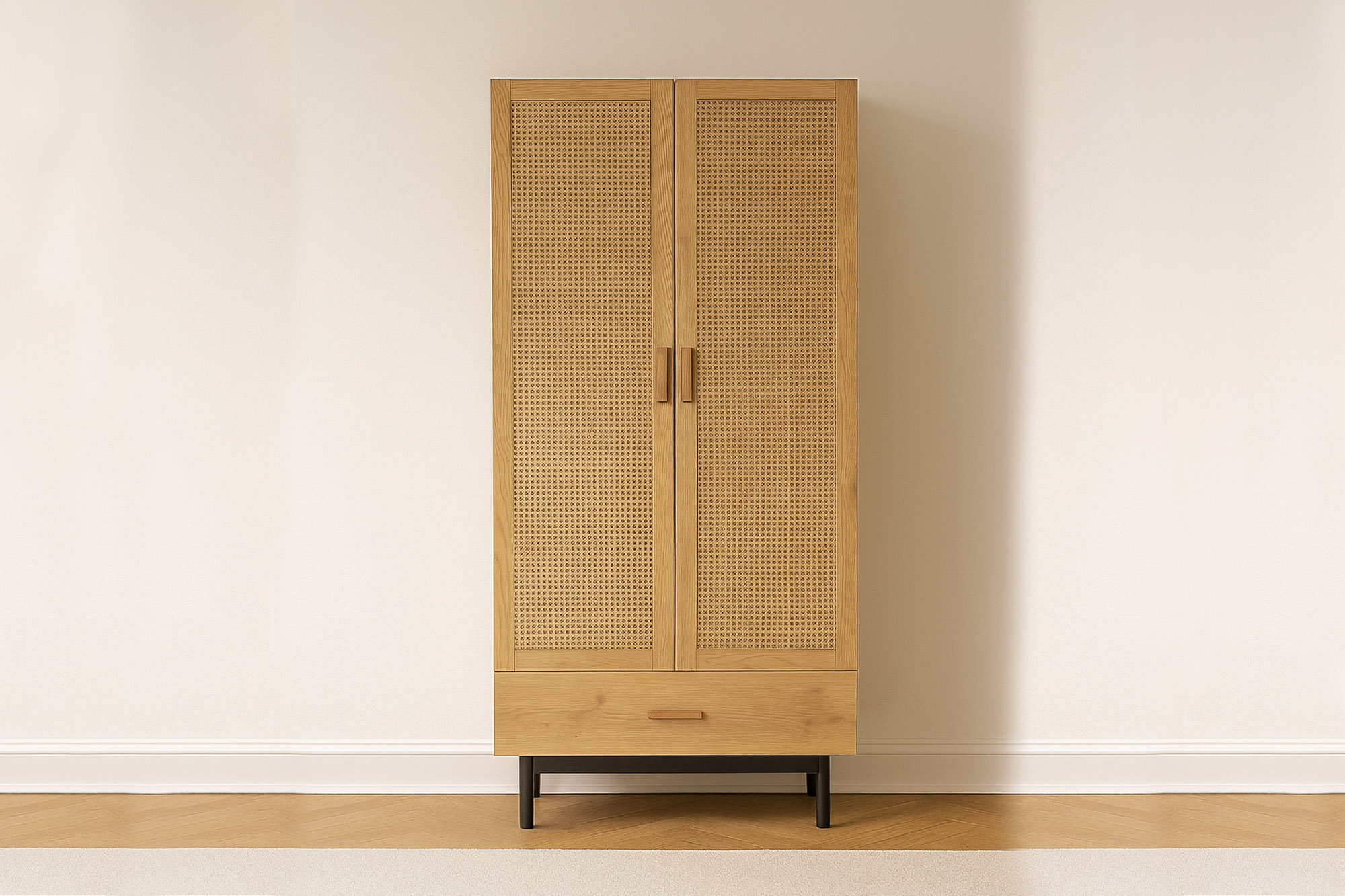 Vitrineskap i nordisk design med stilrene håndtak detaljer. Vitrineskapet er laget i eikefiner av høy kvalitet med nydelig struktur og fargenyanser som fryder. Skapet har to glassdører og 2 hyller til praktisk oppbevaring.